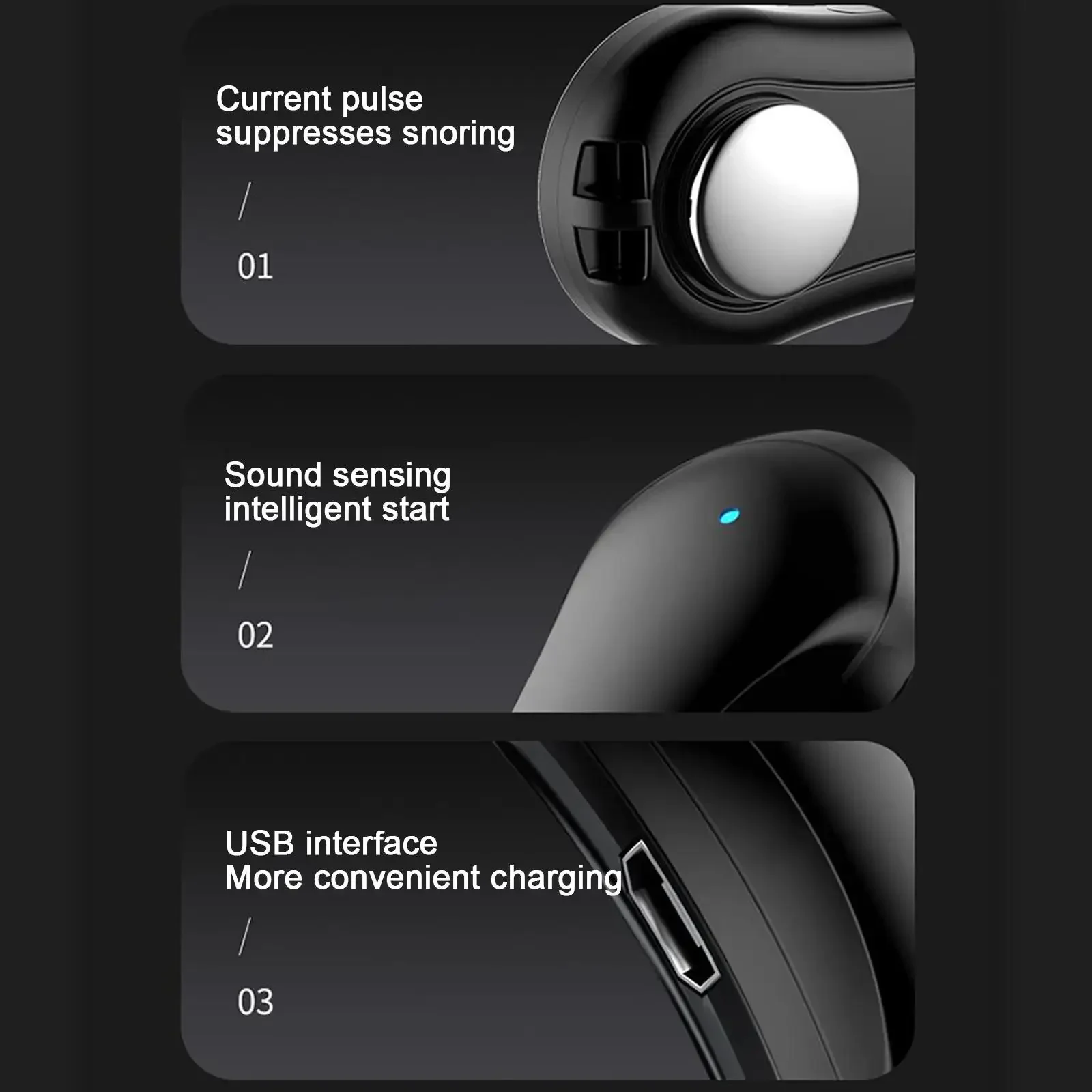 Wear the product during rest, the product will automatically and accurately detect snoring through high-precision sensors, massage the hypoglossal nerve and mandibular muscles through vibration pulses of different frequencies, promote muscle tightening, adjust breathing rhythm, and make breathing easier